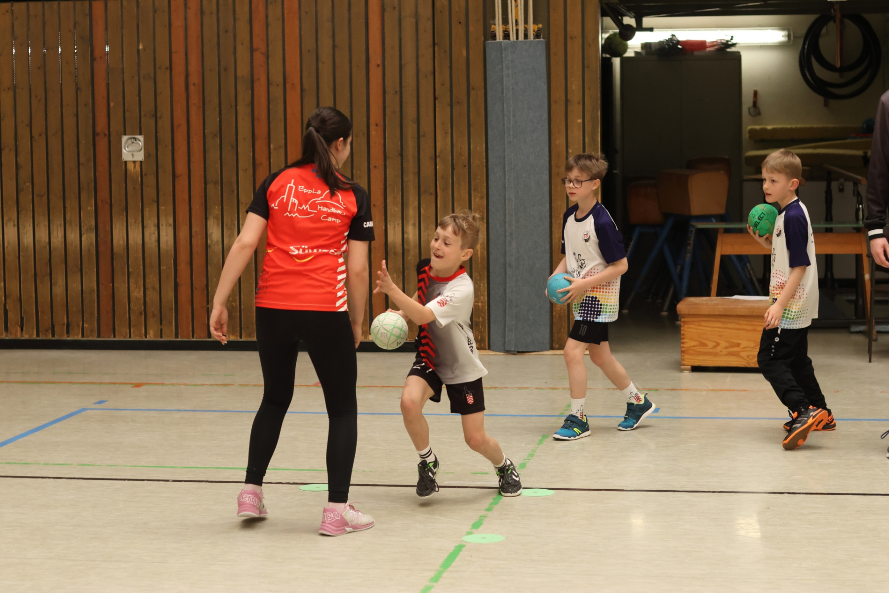 Dennis (Herren 1/Bufdi) brachte die Kinder mit intensiven Übungen rund um Körpertäuschungen ordentlich ins Schwitzen. Da wurde gewackelt, getrickst und so mancher Gegner (gedanklich zumindest) elegant stehen gelassen. Rückraumspieler Felix Schier (Herren 1) widmete sich mit den Camp-Kids dem Kreuzen – hier kam es vor allem auf das richtige Timing an. Und wir wissen ja: Timing ist alles!