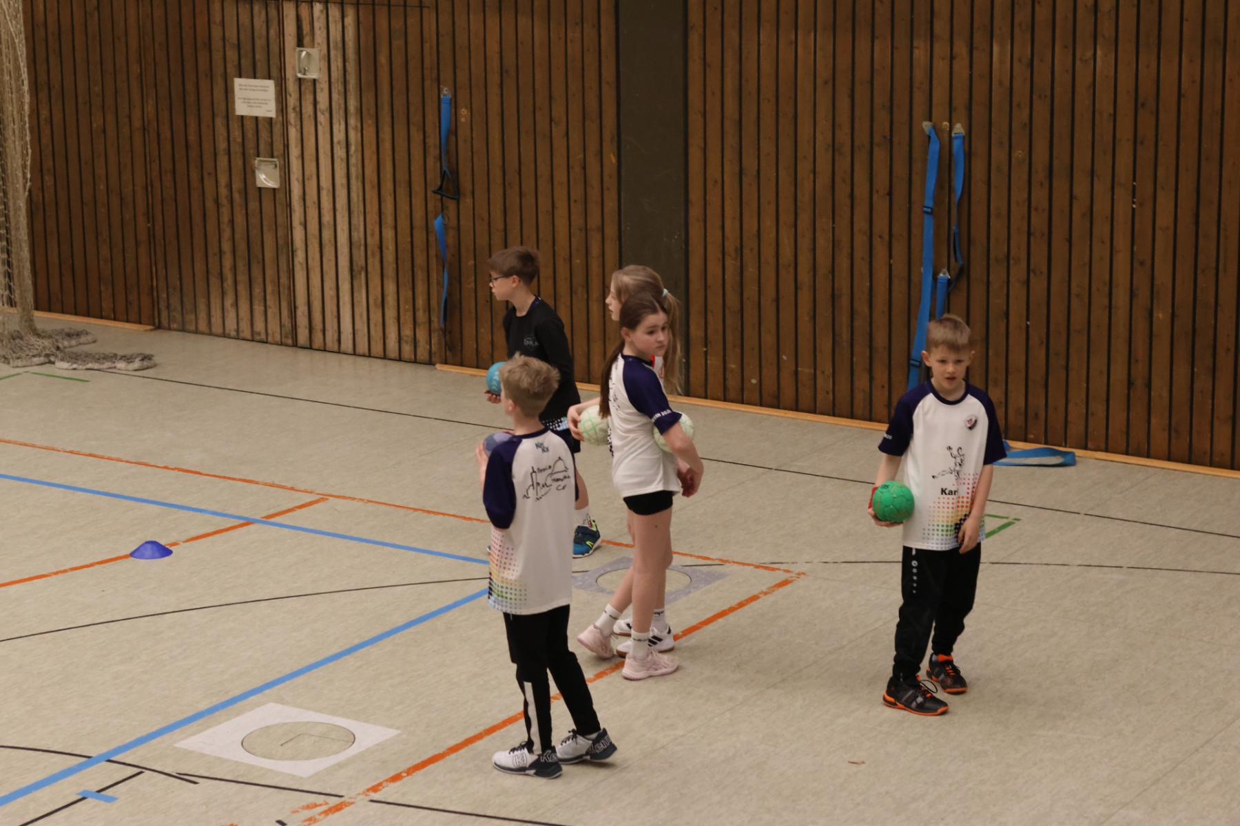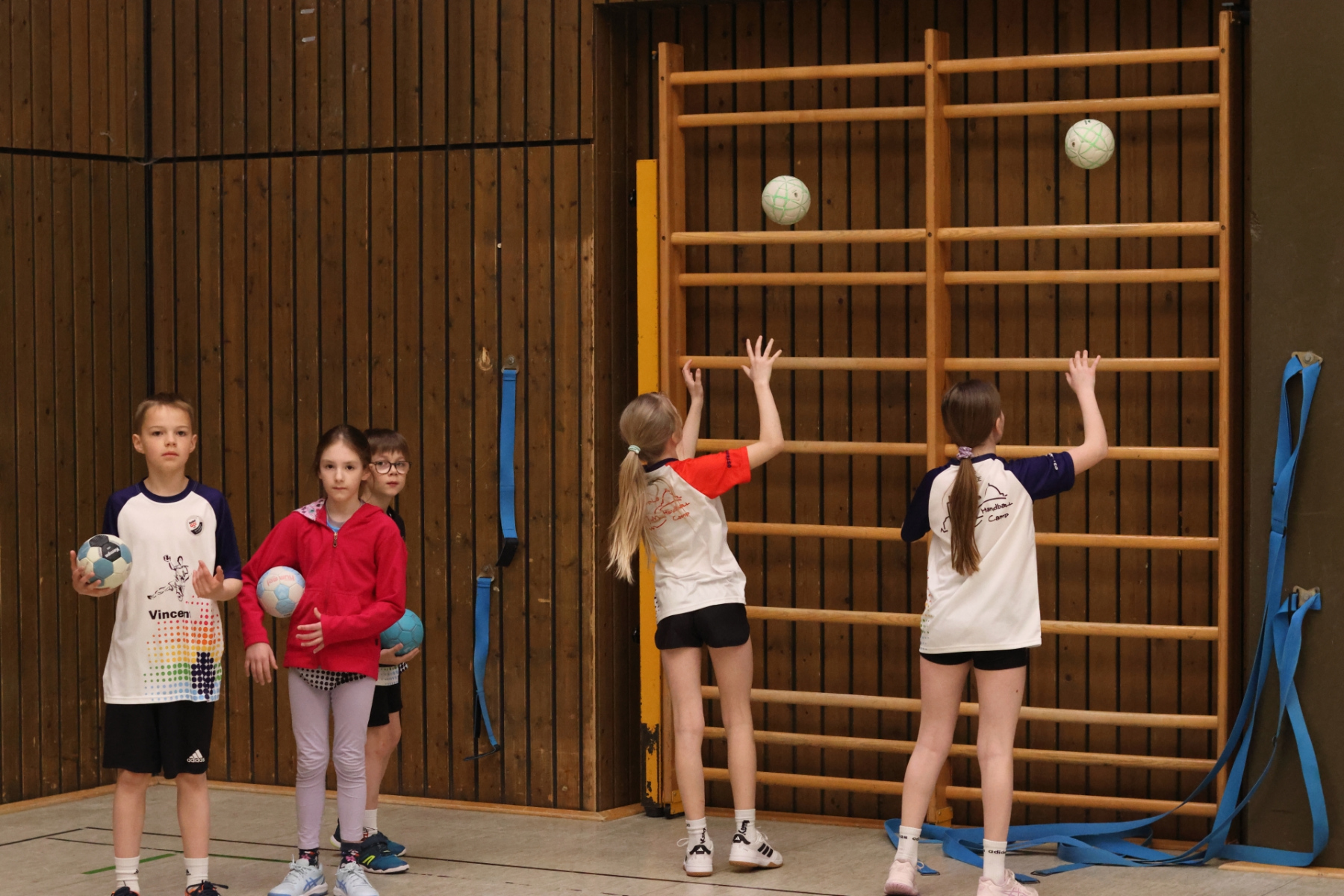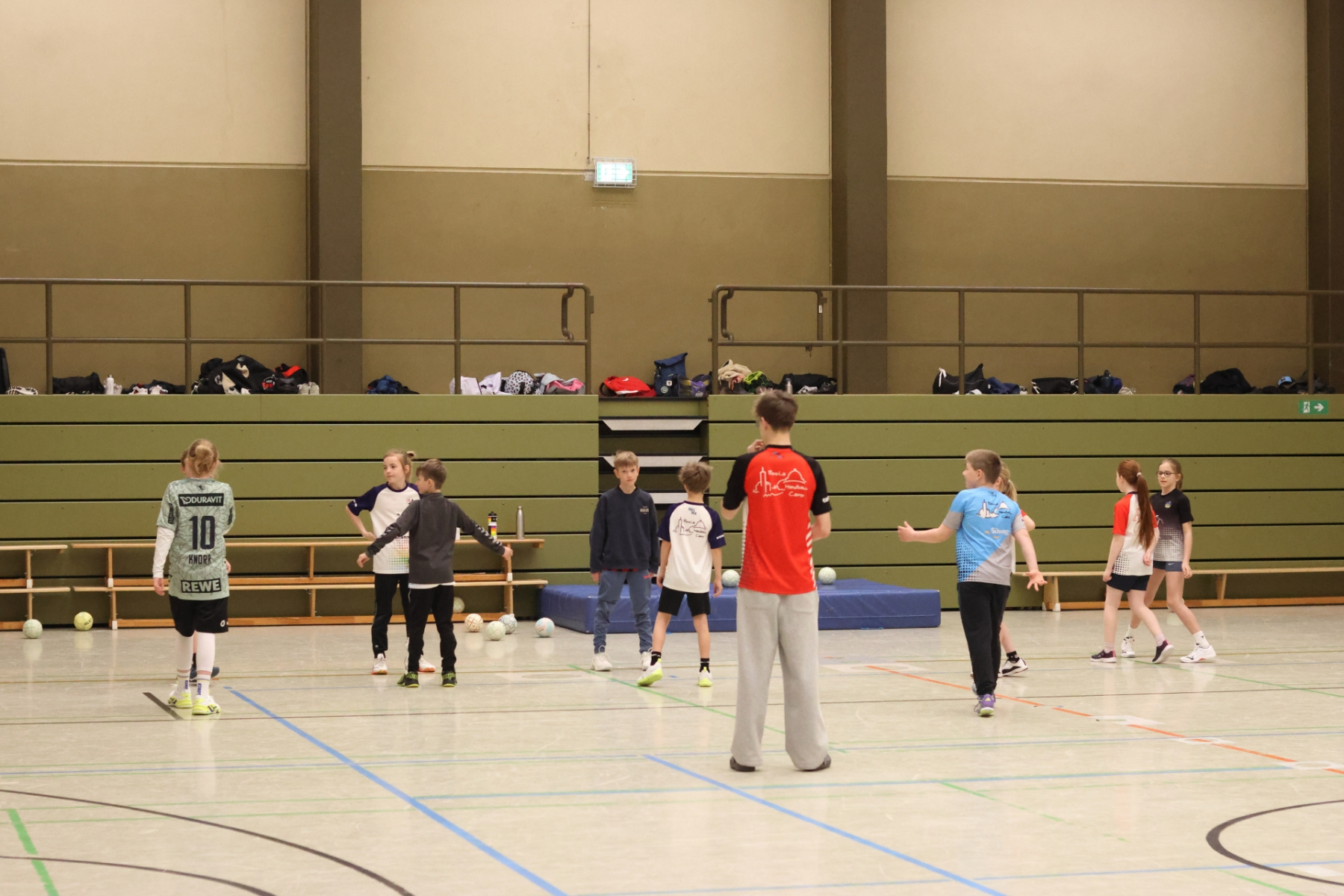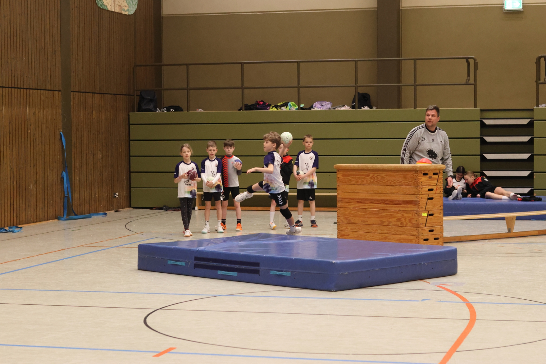 Am Nachmittag ging es etwas kompakter weiter, aber keineswegs weniger intensiv. Jede Gruppe absolvierte noch zwei Trainingseinheiten. Die älteren Gruppen feilten bei Dennis erneut an ihren Würfen aus verschiedenen Positionen. Florian brachte die Beine der Kinder ordentlich zum Glühen, während Romina Amoroso (Damen) mit abwechslungsreichen Übungen die Ballkoordination schulte. Die beiden jüngeren Gruppen nutzten die Zeit für gemeinsames Spielen in der Sporthalle der Burg-Schule – ein perfekter Mix aus Spaß und Bewegung.