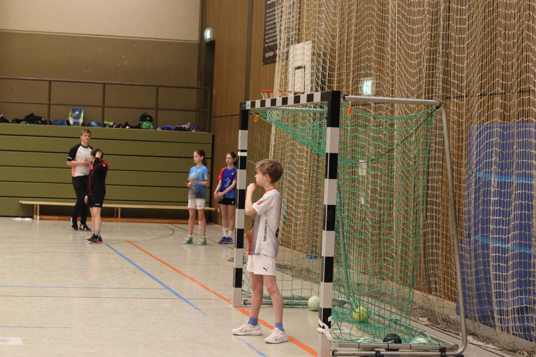 Am Vormittag hieß es: volle Konzentration und nochmal alles rausholen. Moritz Schreyer, Torhüter des Oberliga-Teams der HSG, teilte seinen Erfahrungsschatz rund um Stabilisation und Krafttraining. Zugegeben: Für energiegeladene, hibbelige Nachwuchshandballer waren diese Übungen nicht immer ein Highlight – aber was sein muss, muss sein! Andy Brandl (Herren 3) nahm sich der Würfe von den Außenpositionen an und brachte einige anspruchsvolle Übungen mit. Dennis forderte die Kids mit komplexen Kooperationsübungen, bei denen vor allem das Zusammenspiel mit den Außen gefragt war. Währenddessen arbeiteten Max und Ben (mB-Jugend) intensiv an der Manndeckung, und Friedrich (mB-Jugend) sorgte bei den Jüngsten mit kleinen Spielen in der Grundschulsporthalle für strahlende Gesichter.