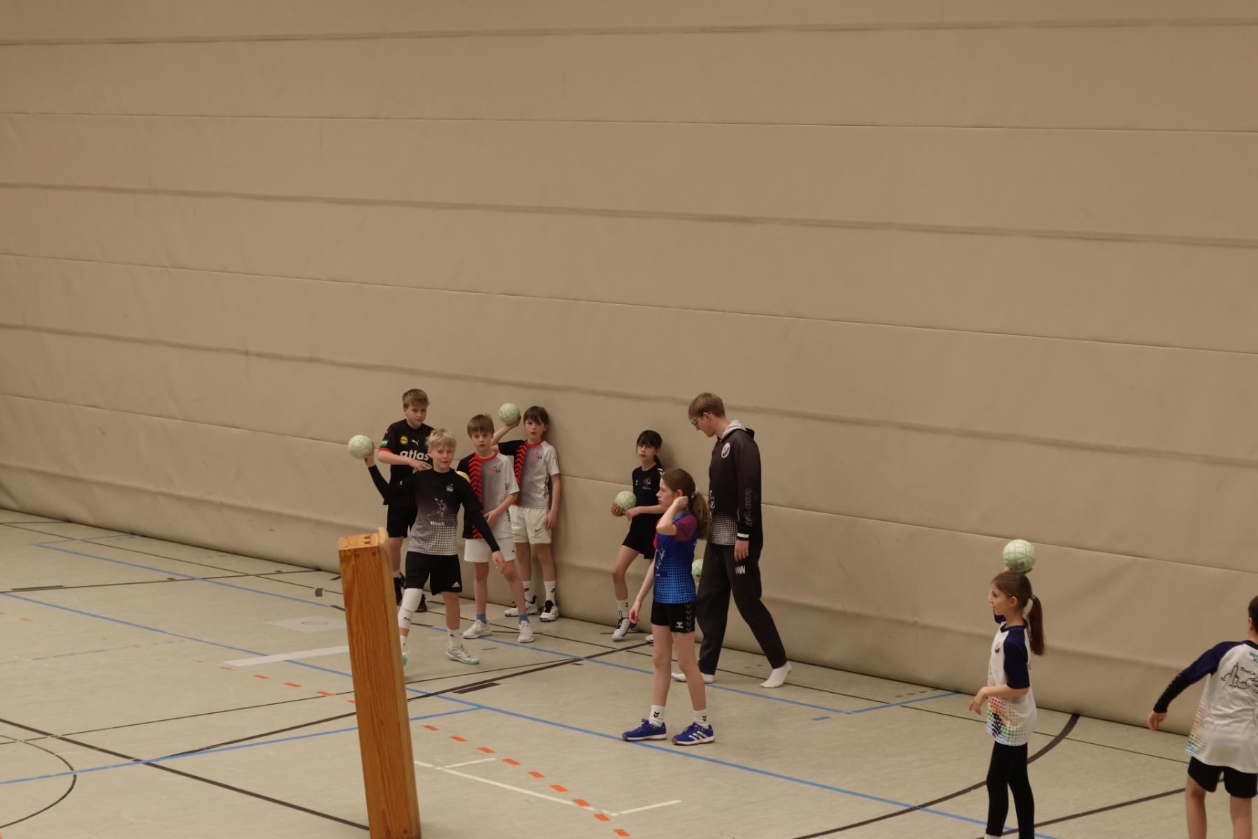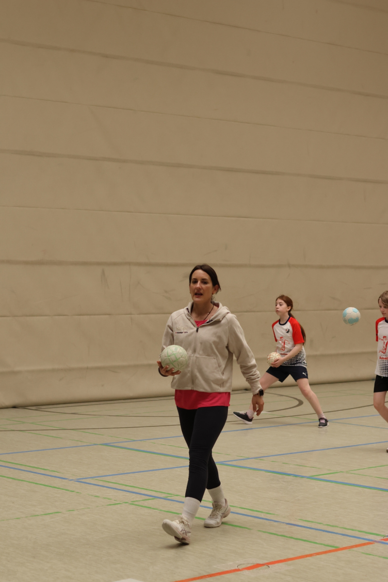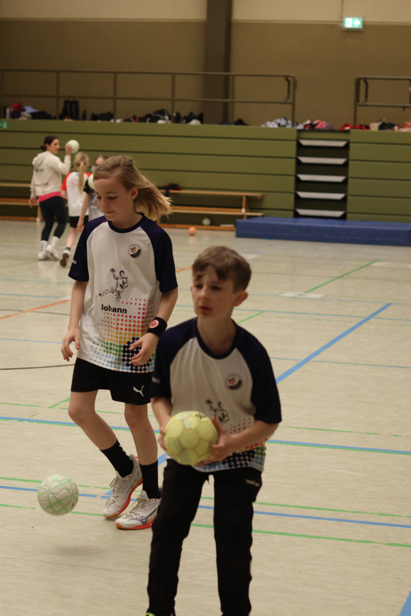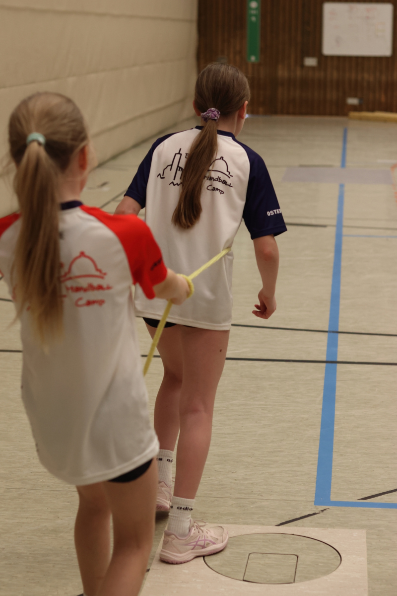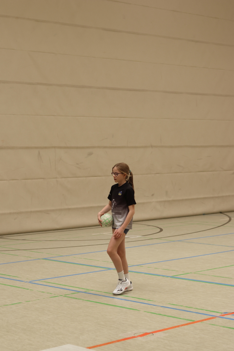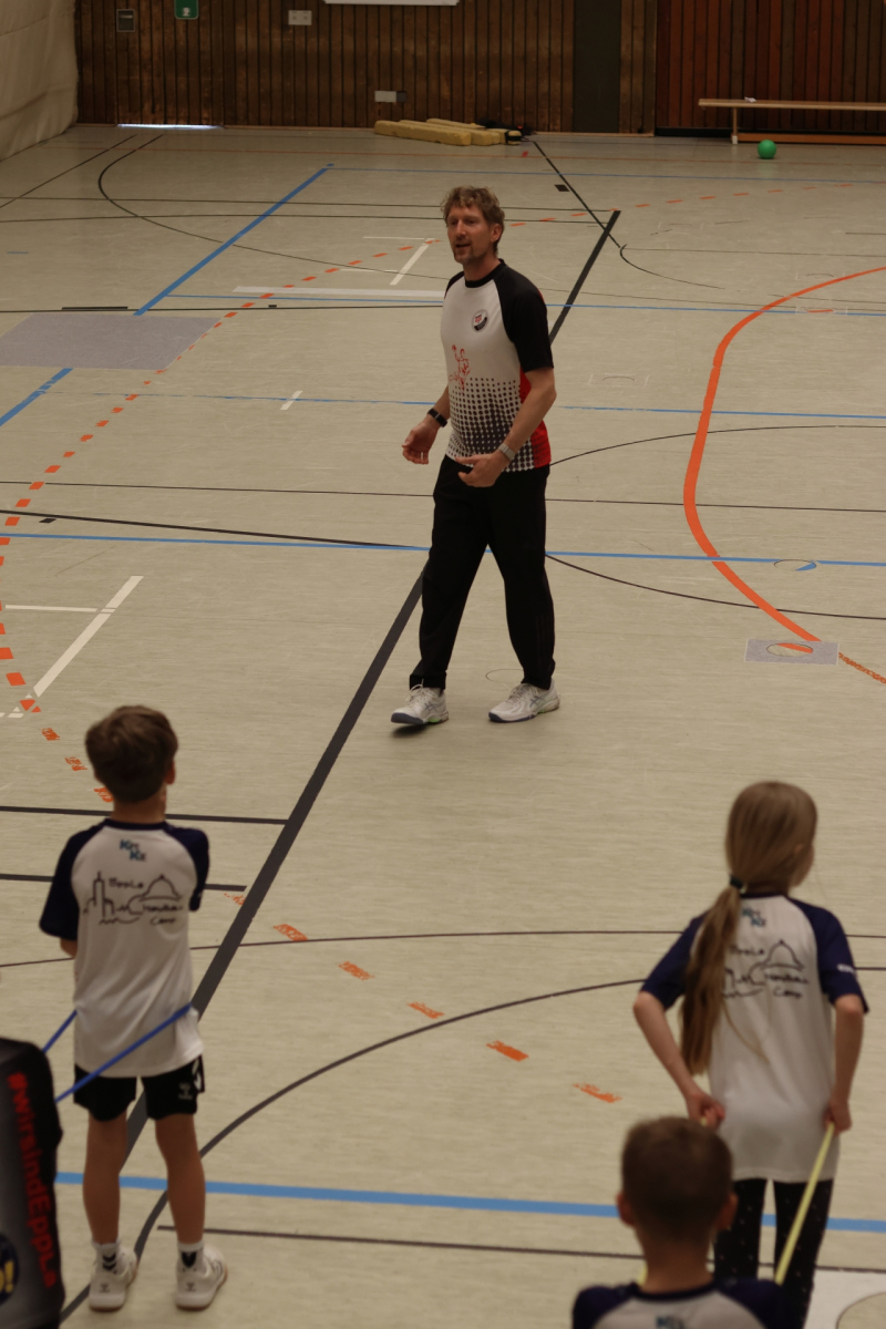 Am Nachmittag ging es etwas kompakter weiter, aber keineswegs weniger intensiv. Jede Gruppe absolvierte noch zwei Trainingseinheiten. Die älteren Gruppen feilten bei Dennis erneut an ihren Würfen aus verschiedenen Positionen. Florian brachte die Beine der Kinder ordentlich zum Glühen, während Romina Amoroso (Damen) mit abwechslungsreichen Übungen die Ballkoordination schulte. Die beiden jüngeren Gruppen nutzten die Zeit für gemeinsames Spielen in der Sporthalle der Burg-Schule – ein perfekter Mix aus Spaß und Bewegung.