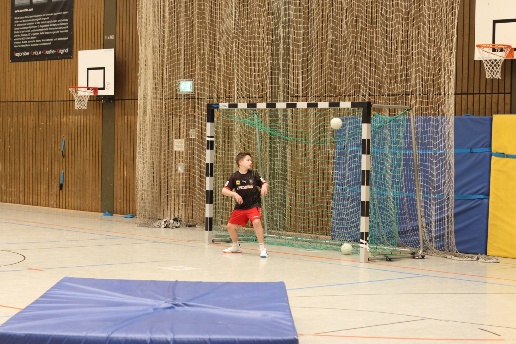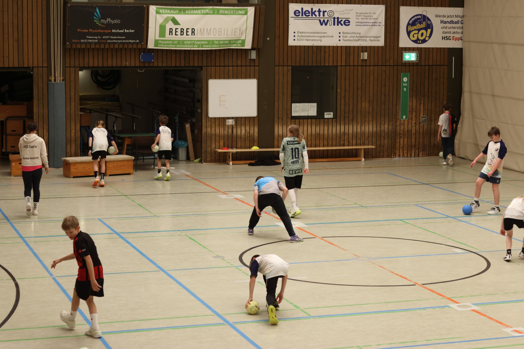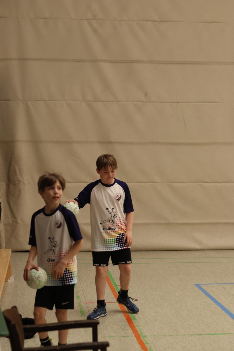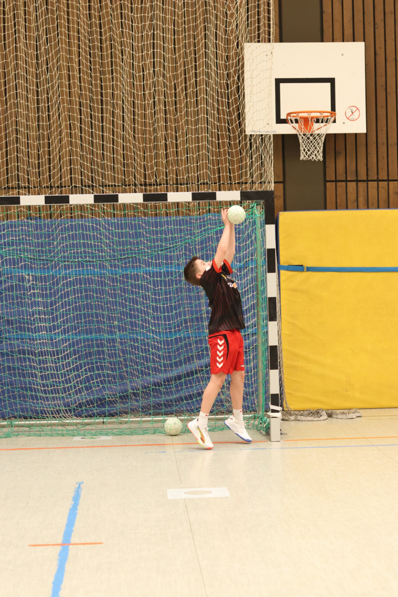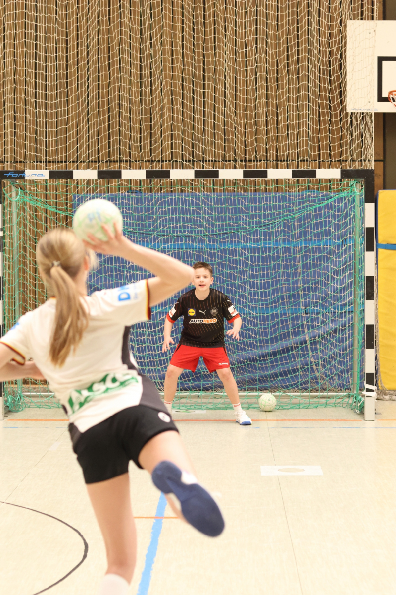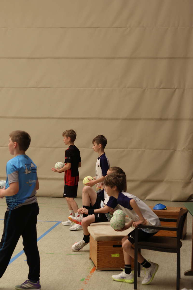 Am Vormittag hieß es: volle Konzentration und nochmal alles rausholen. Moritz Schreyer, Torhüter des Oberliga-Teams der HSG, teilte seinen Erfahrungsschatz rund um Stabilisation und Krafttraining. Zugegeben: Für energiegeladene, hibbelige Nachwuchshandballer waren diese Übungen nicht immer ein Highlight – aber was sein muss, muss sein! Andy Brandl (Herren 3) nahm sich der Würfe von den Außenpositionen an und brachte einige anspruchsvolle Übungen mit. Dennis forderte die Kids mit komplexen Kooperationsübungen, bei denen vor allem das Zusammenspiel mit den Außen gefragt war. Währenddessen arbeiteten Max und Ben (mB-Jugend) intensiv an der Manndeckung, und Friedrich (mB-Jugend) sorgte bei den Jüngsten mit kleinen Spielen in der Grundschulsporthalle für strahlende Gesichter.